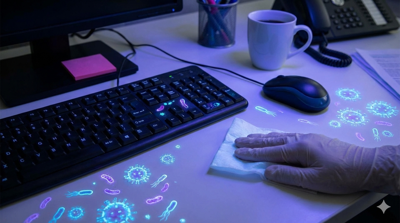 High-touch areas like desks, keyboards, phones, door handles, kitchen counters, and washrooms often carry the most germs. Carpets and upholstery can also trap bacteria.